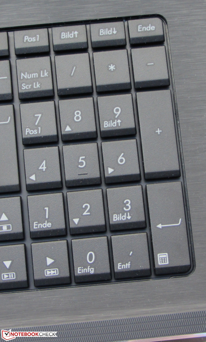 Beim F75A kommt die gleiche herkömmliche Tastatur zum Einsatz wie beim F55A. Die Haupttasten kommen durch die angewinkelten Unterseiten auf eine Auflagefläche (flach, keine Wölbung) von etwa 17 x 14 mm. Der Druckpunkt der einzelnen Tasten ist gut zu erkennen. Sie besitzen einen mittleren Hub und einen etwas zu laschen Widerstand. Hier hätte die Federung etwas straffer ausfallen dürfen. Die Tasten sind weder sonderlich laut noch sonderlich leise. Während des Tippens wippt die Tastatur zudem deutlich.