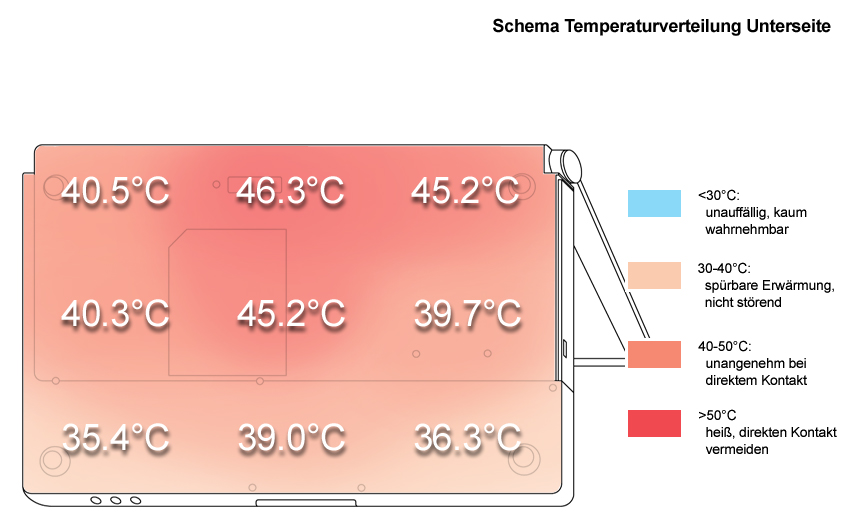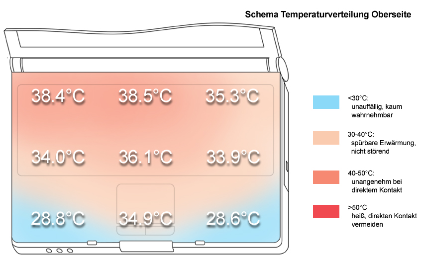 Beim Betrieb am Schreibtisch ist diese Gehäusetemperatur durchaus verkraftbar, im mobilen Betrieb, eventuell sogar am Schoss des Benutzers könnte es aber schon etwas unangenehm werden.