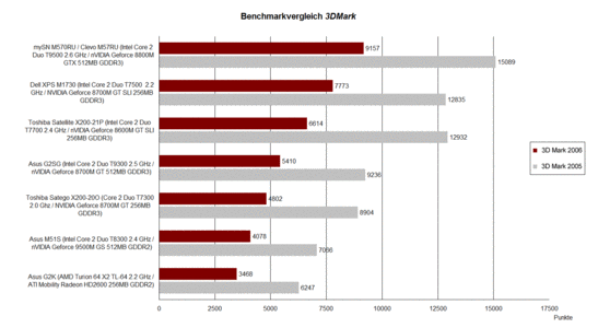 Auch hinsichtlich Grafik wurde dem G2SG ein neuer Chip verpasst. Im Notebook findet eine Geforce 8700M GT mit 512MB schnellem GDDR3 Videospeicher Verwendung. Nach der 8800 GTX und diversen SLI Lösungen zählt dieser Grafikchip nach wie vor zur Leistungsklasse 1 in unserem Vergleich mobiler Grafikkarten, was der Grafiklösung gute Leistungsreserven bescheinigt. Dies kann man auch im 3D Mark Benchmarkvergleich erkennen. Das G2SG setzt sich klar vor das G2K mit Turion CPU und ATI Grafik bzw. bleibt auch vor nVIDIAs neuer Mittelklasse Grafikkarte der Geforce 9500M GS im Asus M51S. Die Nase voran haben dennoch diverse SLI Lösungen (8600M GT und 8700M GT SLI) bzw. die 8800M GTX als zurzeit stärkster verfügbarer Grafikchip für Notebooks.