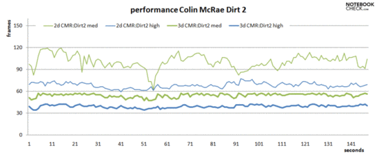 Insgesamt reichen die Leistungsreserven der GTX 460M Grafikkarte sogar, um bei 3D-Darstellung Abstriche von bis zu 50% zu verkraften, und dennoch auf hoher Detailstufe bei zahlreichen aktuellen Games eine ausreichend flüssige Bildwiederholungsrate zu liefern.