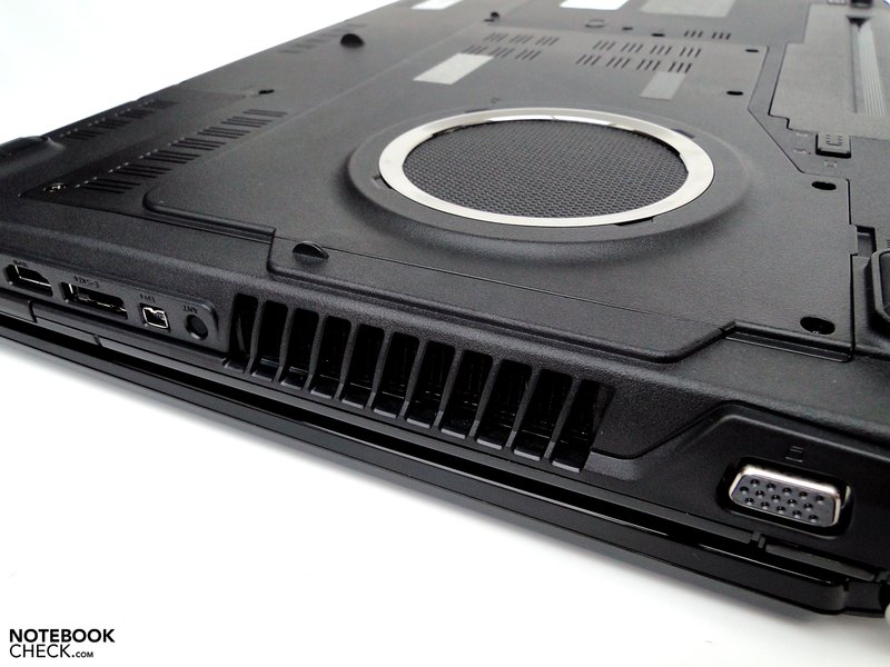 Der Lufteinlass an der Unterseite imitiert zwar optisch einen riesigen Subwoofer, bereits nach kurzem Reinhören in die gebotene Soundkulisse klärt sich aber ein mögliches Missverständnis, leider. Der Sound der aus den Lautsprechern links und rechts oberhalb der Tastatur dringt bietet kaum Volumen und gibt sich ausgesprochen dünn und kraftlos. Letztlich kann nicht einmal die maximale Wiedergabelautstärke überzeugen, da helfen auch diverse Aufkleber, wie etwa der Verweis auf EAX von Creative Labs recht wenig. Für eine entsprechende Stimmung bei Computer-Games aber auch bei der Wiedergabe von Filmen sind auf jeden Fall externe, aktive Lautsprecher zu empfehlen, oder zumindest ein hochwertiges Kopfhörer-Set.