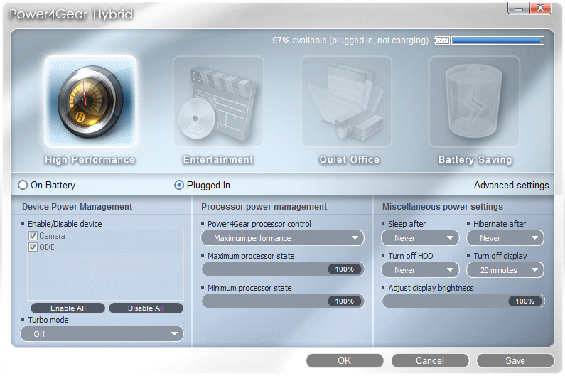 Es gilt zuerst das Tool „Power 4 Gear“ zu finden, welches unter anderem einzelne Leistungsmodi bietet die mit der zugehörigen Zusatztaste gewechselt werden können. Im Tool findet man recht unscheinbar links unten die Option „Turbo Mode“. Wird diese aktiviert, geht bildlich gesprochen zugleich das Logo für „High Performance“ in Flammen auf.