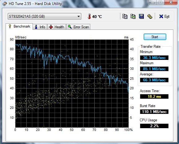 Bei der Festplatte hat sich Asus für den Hersteller Seagate entschieden. Gleich zwei Festplatten mit jeweils 320 GByte Kapazität verrichten im G60VX ihre Arbeit. Deren Leistungswerte haben wir mit dem Tool HDTune ermittelt. Die Systemfestplatte lieferte dabei durchwachsene Werte. So kann sich die Übertragungsrate mit durchschnittlich 66.3 MB/sek mehr als sehen lassen, eine Zugriffszeit von 18.2 ms und eine Durchsatzrate von 110.1 MB/sek bleiben jedoch etwas unter den Erwartungen zurück. Die Werte der zweiten Festplatte unterscheiden sich leicht. So liegt die Transferrate mit 70.3 MB/sek etwas höher und damit auf einem sehr guten Niveau. Demgegenüber fällt die Durchsatzrate mit 73.4 MB/sek eher mäßig aus. Die Zugriffszeit schließlich liegt mit 16.0 ms etwas niedriger.