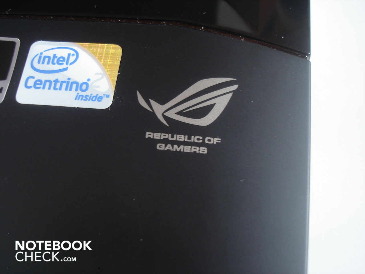 Auf den ersten Blick fällt sofort die optisch deutliche Verwandtschaft zum größeren und 17-zölligen Bruder Asus G71GX auf. Die Gehäuse gleichen sich von der Konstruktion her, bis auf Details, wie ein Auge dem anderen. Allerdings unterscheidet sich das G60VX teilweise in der Farbgebung und den eingesetzten Materialien. So hält sich Asus im Gegensatz zum G71GX etwas mehr zurück und gestaltet das G60VX dezenter. Zwar macht der weiße Displaydeckel mit seinem futuristischen Imprint sofort auf sich aufmerksam, das restliche Gehäuse bleibt jedoch mit seiner Dunkelblau/Schwarz Kombination wesentlich unauffälliger als das G71GX mit seiner teils knallroten Oberfläche. Zwar besitzt auch das G60VX eine Beleuchtung. Im Gegensatz zum G71GX beschränkt sich diese dabei auf das „Republic of Gamers“-Logo und eine horizontale Leiste, die sich beide auf dem Displaydeckel befinden. Auf die zwei vertikalen und wild blinkenden Leisten, die beim G71GX um Aufmerksamkeit buhlen, hat Asus (glücklicherweise) verzichtet. Die Handballenauflage ist mit einer leichten Gummierung versehen und wirkt deshalb allein schon optisch hochwertiger als das graue „Wabenmuster“ des G71GX.