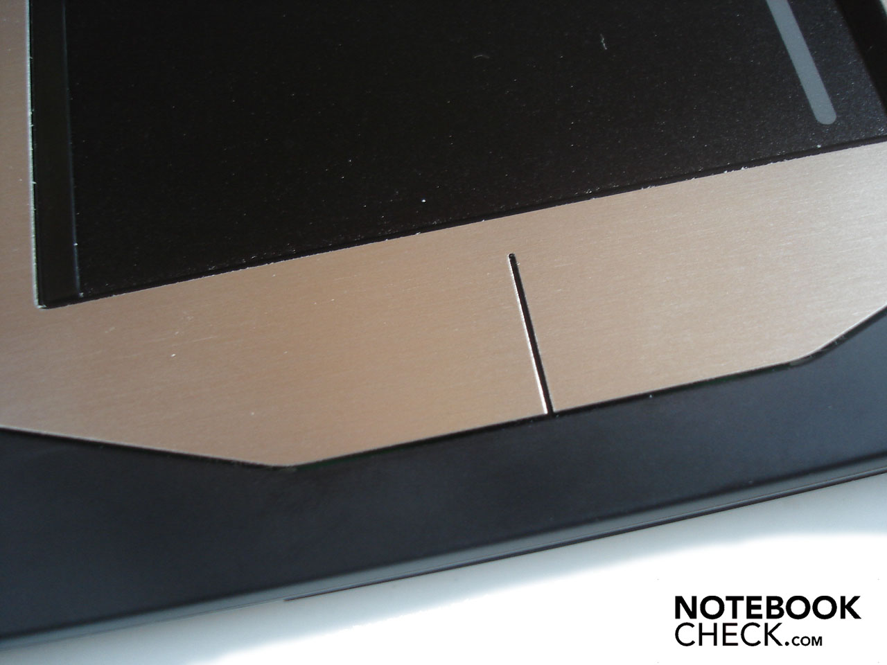 Das Touchpad macht hingegen rundum eine gute Figur. Sowohl die Positionierung als auch die Größe gehen in Ordnung. Die glatte Oberfläche verfügt über anständige Gleiteigenschaften und der etwas abgesenkte Rand sorgt für ein sensorisch markantes Feedback. Zudem verfügt das Touchpad über eine gekennzeichnete vertikale Scrollleiste. Unverständlicherweise ist der Scrollbereich ungewohnt breit ausgefallen, so dass unnötig viel Bewegungsspielraum des Mauszeigers verschenkt wird. Die beiden Tasten des Touchpads sind in der hochwertigen und silbernen Umrandung aus Aluminium integriert und bieten einen ordentlichen Druckpunkt sowie ein akustisch gut wahrnehmbares Feedback.