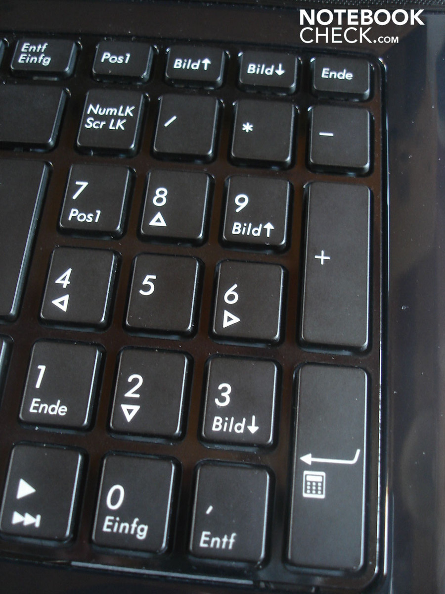 Die Tastatur wollte uns auch nach dutzenden Stunden Betrieb nicht so recht gefallen. Ein Grund dafür ist die mäßige Stabilität. So gibt die Tastatur insbesondere mittig und im Bereich des Nummernblocks ordentlich nach. Außerdem war uns der Tastenanschlag zu schwammig und das Geräusch beim Auslösen der Tasten zu klapprig. Da die Tasten zudem relativ klein sind, sammelt sich in den großen Zwischenräumen schnell Schmutz an. Die Zwischenräume lassen sich allerdings einigermaßen gut reinigen. Die Pfeiltasten und die Tasten des Nummernblocks sind nicht nur klein, sondern zusätzlich auch schmäler wie der Rest, weshalb man gerne mal daneben tippt.