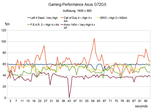 Die Spieleleistung lässt sich zusammenfassend als sehr gut einordnen. Bis auf Crysis lassen sich alle von uns getesteten Titel in hohen Details und der nativen Auflösung von 1600 x 900 flüssig darstellen. An ein System mit Core i7 und höher getakteter GeForce GTX 260M kommt das Asus G72GX dennoch nicht heran: Schade. Im Vergleich mit der Radeon HD 4850 kann sich die GeForce GTX 260M gut halten. Insgesamt zeichnet sich jedoch ein kleiner Vorsprung für die Radeon HD 4850 ab.