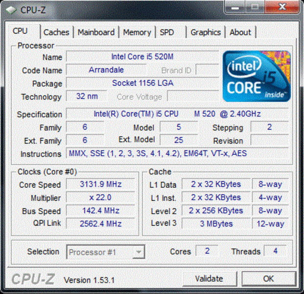 Gefertigt wird die CPU-Einheit in 32 nm, zudem enthält der Core i5-520M 512 KByte L2- sowie 3 MByte L3-Cache. Der Energieverbrauch ist mit 35 Watt als überdurchschnittlich einzuordnen. Intels Vierkerner der Core i7-Reihe verbrauchen mit 45-55 Watt allerdings noch mehr. Weiteres Merkmal des Core i5 ist fernerhin der in 45nm Strukturbreite produzierte, integrierte Grafikchip namens GMA HD. Von der Leistungsfähigkeit ist die GMA HD jedoch eher bescheiden und in etwa auch Niveau der HD 4200.