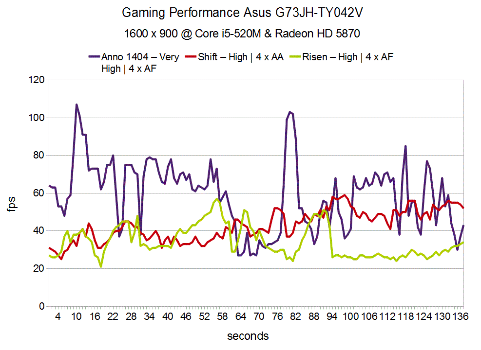 Bisher hat es kaum eine mobile Grafikkarte geschafft, das Rollenspiel Risen in hohen Details und 4x AF über 35 fps zu befeuern. In dieser Beziehung bildet auch das Asus G73 keine Ausnahme und erreicht 34.4 fps. Da Rollenspiele aus der Third-Person-Ansicht bereits ab rund 30 fps relativ flüssig wahrgenommen werden, ist es aber nicht nötig, die Details herunter zu regeln oder auf Qualitätsverbesserungen zu verzichten.