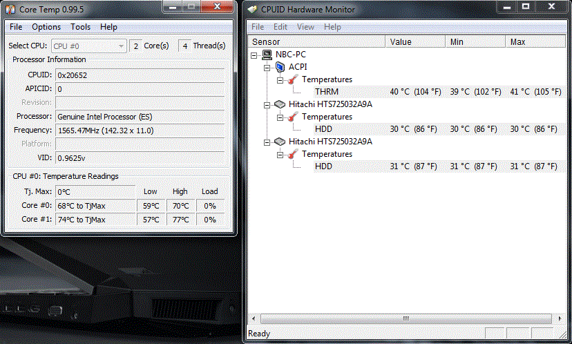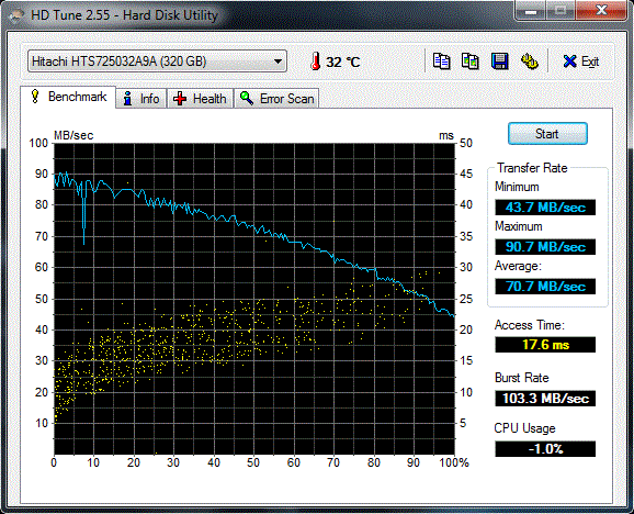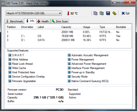 Zwei 320 GByte Festplatten von Hitachi sorgen für eine Gesamtkapazität von respektablen 640 GByte. Auf einen RAID-Verbund hat Asus verzichtet. Dafür hat man sich dazu entschlossen, die beiden Festplatten in insgesamt vier Partitionen aufzuteilen. Bei der Systemfestplatte mag diese Vorgehensweise noch in Ordnung sein, die zweite Festplatte dürften die meisten Nutzern hingegen wohl unpartitioniert bevorzugen. Von den Werten können sich die Festplatten durchaus sehen lassen. Die Übertragungsrate ist mit 70.7-72.9 MB/Sek für HDDs auf einem sehr guten Niveau (SSDs erreichen rund das doppelte).
