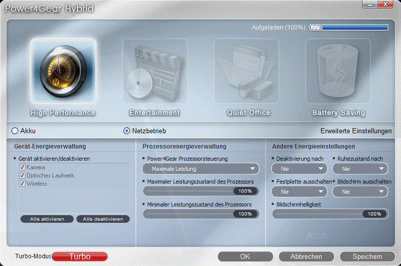 Mit dem „Control Deck“ erhält man beispielsweise Zugriff auf wichtige Funktionen wie Displayhelligkeit, Lautstärke, Auflösung und Energiesparpläne ohne sich lange durch die Windowsmenüs kämpfen oder die entsprechenden Funktionen auf der Tastatur suchen zu müssen. Mithilfe der „Splendid“-Technologie kann das Bild demgegenüber anhand von verschiedenen Modi (z.B. Soft & Vivid) an die eigenen Bedürfnisse angepasst werden. Wichtigster Bestandteil der Softwareinstallation ist aber wohl „Power4Gear Hybrid“. Dabei handelt es sich um vier Asus-exklusive Energiesparpläne, die sich zu den drei von Windows bekannten hinzugesellen. Mit „Power4Gear“ lässt sich auf einer übersichtlichen Oberfläche an den wichtigsten Stellschrauben drehen (siehe Screenshot).