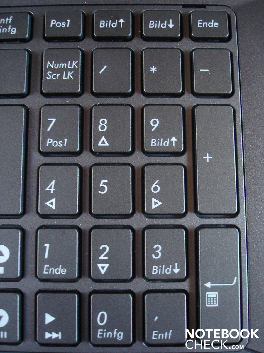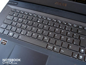 Die schicke Tastatur im Chiclet-Design macht auf den ersten Blick einen guten Eindruck. Nach kurzer Zeit werden allerdings die ein oder anderen Schwachstellen ersichtlich. So empfanden wir den Druckpunkt einerseits als recht schwammig. Andererseits gibt die Tastatureinheit, vor allem im linken Bereich oberhalb des optischen Laufwerks, bereits bei verhältnismäßig geringem Druck spürbar nach. Zudem sind die Pfeiltasten sowie die Tasten des Nummernblocks etwas schmal geraten und das, obwohl eigentlich genügend Platz vorhanden gewesen wäre. Pluspunkte kann die Tastatur hingegen durch ihr gelungenes Layout und die regelbare sowie dezent weiße Tastaturbeleuchtung sammeln. Diese sorgt selbst in absoluter Dunkelheit für eine schnelle Orientierung.