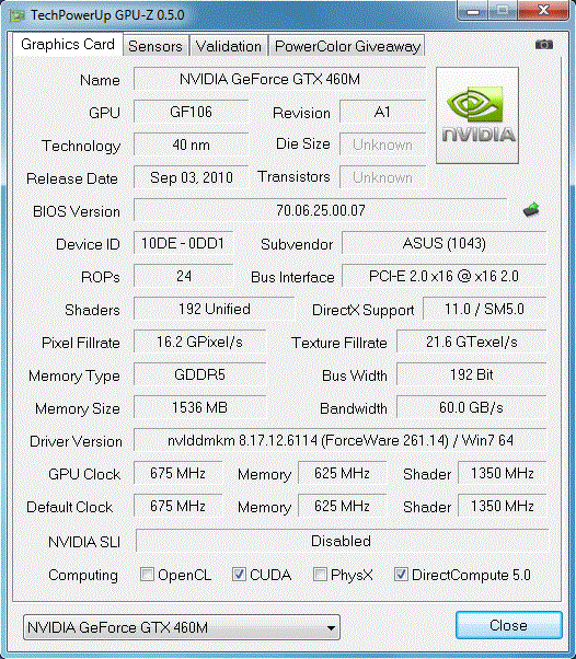Um den Prozessor nicht auszubremsen, stellt Asus dem Core i7-2630QM eine High-End-Grafikkarte zur Seite. Die GeForce GTX 460M basiert auf Nvidias moderner Fermi-Architektur (GF106 Chip) und wird im 40nm Verfahren produziert. Die Taktraten können sich durchweg sehen lassen, 675 MHz (Kern), 625 MHz (Speicher) und 1350 MHz (Shader) entsprechen den Vorgaben von Nvidia. Im Vergleich zum aktuellen Top-Modell, der GeForce GTX 485M, muss sich die GeForce GTX 460M trotzdem deutlich geschlagen geben, statt 384 Shader sind es hier „nur“ 192 Shader.