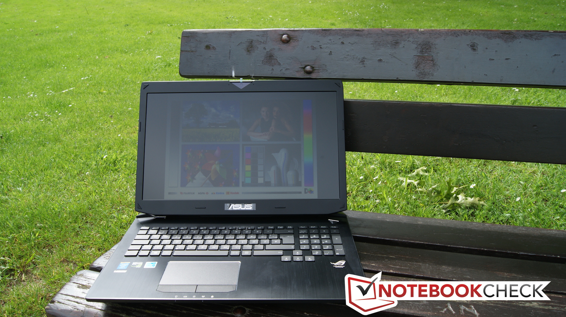 Beim Thema Leuchtkraft reiht sich das AU Optronics auch hinter so manchem Kontrahenten ein. 277 cd/m² werden vom 17-Zoll-Liebling Chi Mei N173HGE übertroffen (siehe z. B. das One K73-4N). Dank dem reflexionsarmen Finish macht das G750JM im Außeneinsatz dennoch eine gute Figur. Unsere Fotos zeigen die Sichtbarkeit bei verschiedenen Positionen. Apropos Licht: Die Ausleuchtung des Testgeräts war subjektiv recht bescheiden (fleckiges Schwarzbild).