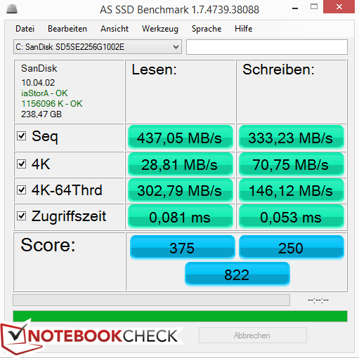 Wie schon benannt, sind in dem Asus G750JS zwei Festplatten verbaut, davon eine SSD, welche ab Werk in zwei Partitionen unterteilt ist. Die SSD unterteilt sich in ein 100 GB Systemlaufwerk und ein Datenlaufwerk mit 120 GB auf. Die Magnetfestplatte wurde gleichmäßig in zwei Teile gesplittet. Diese Kombination ermöglicht kurze Zugriffszeiten und gleichzeitig genügend Speicher für allerlei anfallende Daten. Die Zugriffszeit der 1,5 TB großen HDD von über 16 ms steht in keiner Relation zu den Werten der SSD.