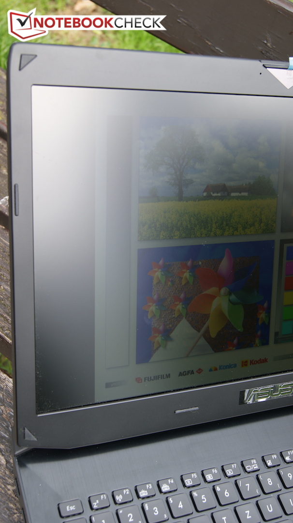 Im Außeneinsatz wird wohl kaum einer das über vier Kilogramm schwere Notebook nutzen wollen, obwohl matte Displays potentiell für einen Einsatz im Freien ausgelegt seien können. Aber in Kombination mit der vergleichsweisen niedrigen Ausleuchtung sieht das Display recht düster aus und sollte nicht bei direkter Sonneneinstrahlung genutzt werden. In einer etwas schattigeren Umgebung lässt sich bei maximaler Helligkeit ohne unschöne Reflexionen ganz gut arbeiten.