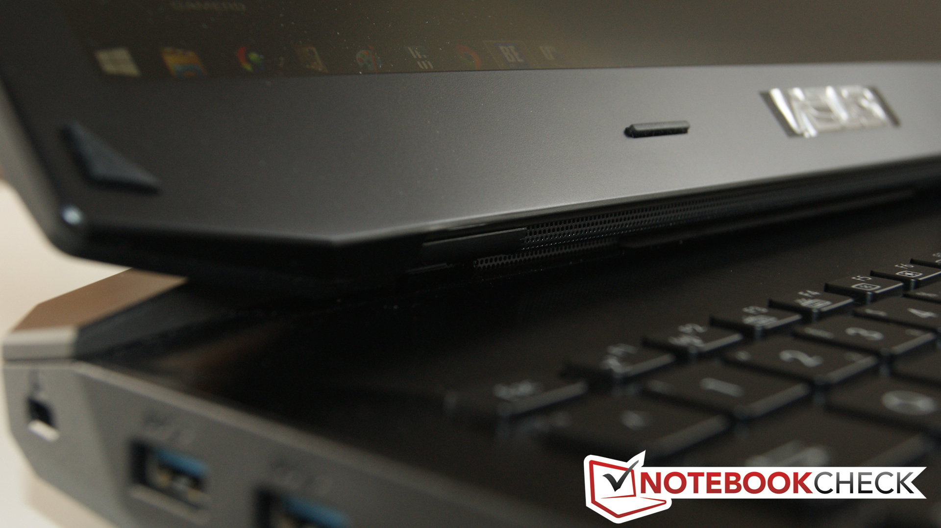 Die unter dem Display verbauten Lautsprecher und der im Durchmesser 3 cm große Subwoofer, der sich auf der Unterseite befindet, sind für den normalen Heimgebrauch mehr als nur ausreichend. Besonders die Lautstärke lässt sich äußerst hoch drehen und die durch den Subwoofer entstehenden Bässe sind auch für ein Notebook akzeptabel. Bemängeln könnte man die Standardkonfiguration ab Werk, welche etwas zu viele Höhen liefert und eingestellt werden sollte. Insgesamt liefert das 2.1 Soundsystem einen guten Klang, welchen man bei nicht vielen Notebooks hören kann.