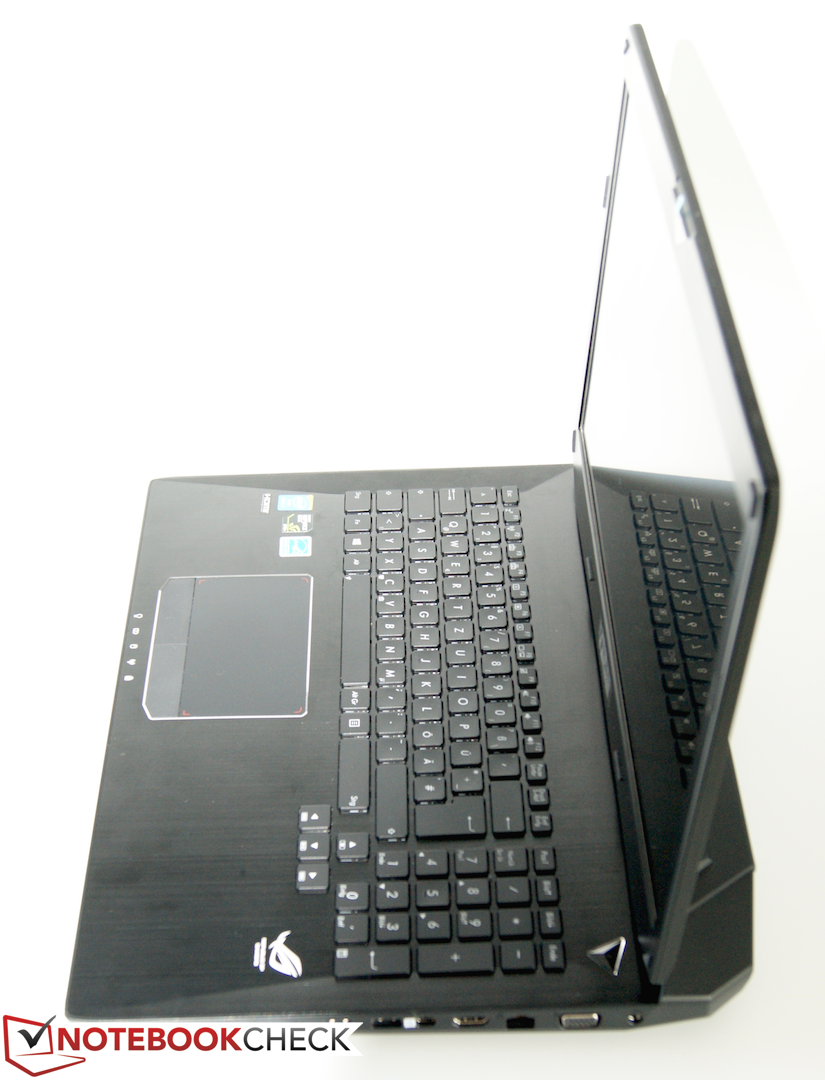 Aufgeklappt findet sich ein gebürstetes Aluminium-Panel rund um die Tastatur, welches trapezförmig die Arbeitsfläche an den Seiten abflacht. Das chromumrandete Trackpad und das ROG-Logo ziert den Tastaturbereich. Der äußere und aufgeklappte Blick, durch das Zusammenspiel von Materialien und Kanten, lassen auf das Innere schließen. Nachteilig macht sich die Gummibeschichtung bemerkbar, wenn es um das Thema Sauberkeit geht, da diese wie ein Magnet für Staub wirkt und das gebürstete Panel keinen Fingerabdruck verzeiht.