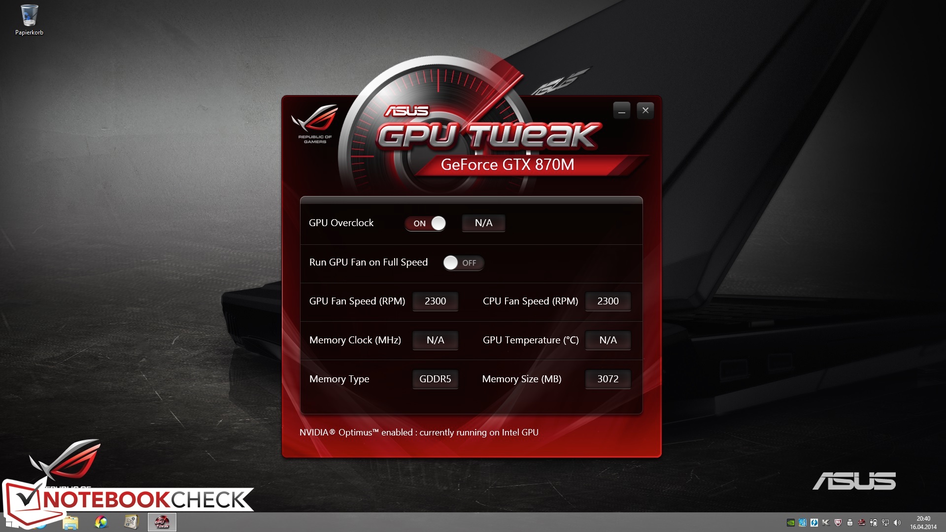 Die Nvidia Geforce GTX 870M ist eine Oberklassengrafikkarte basierend auf Nvidias Kepler-Architektur und besitzt in unserem Fall 3 GB eigenen Speicher und ist mit einem von Asus übertakteten Kerntakt von 981 - 1.000 MHz statt 941 - 967 MHz versehen. Der Optimus-Treiber von Nvidia steuert das vom Nutzer unbemerkbare Wechseln beider Grafikeinheiten. Die Übertaktung der Grafikkarte haben wir im 3DMark11 getestet und die Differenz beider Ergebnisse lag bei nicht einmal 3 %. So erzielte die Nvidia GTX 870M mit 7.151 Punkten rund 185 Punkte mehr als der Test ohne Übertaktung.