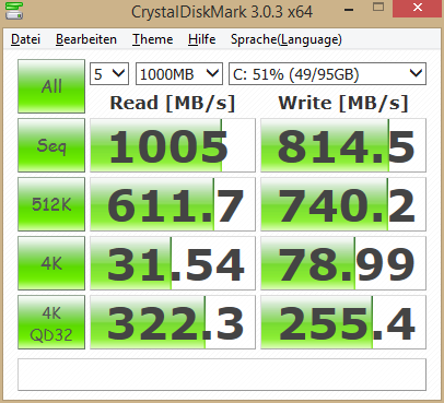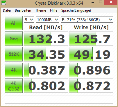 In Sachen Massenspeicher bekommt es die Single-SSD des Testgeräts mit vier (MSI GT72) respektive zwei Solid State Drives (Asus G750JZ) zu tun. Bei den reinen Zugriffszeiten bringt das bekanntermaßen keine Vorteile mit sich, vermag aber die Transferleistung beim sequenziellen Lesen und das gleichzeitige Einlesen kleiner, verteilter Datenblöcke mit mehreren Threads (4k-64) zu beschleunigen. Dementsprechend stellen sich die Ergebnisse des AS SSD Benchmarks und des CrystalDiskMarks 3.0 dar, wenn man das Testgerät und das MSI im Auge behält. Die im Asus G750JZ verbauten Sandig SSDs (RAID 0) leiden offenbar unter einer geringeren Ausgangsperfomance, die durch das RAID nur teilweise ausgeglichen wird. Auf jeden Fall schlägt sich die Samsung RBU-SNS8100S3256GD1 im G751JY hervorragend; wir wagen mal die Behauptung, dass der Vorsprung des auch durch die vielen SSDs so teuren MSI GT72 eher theoretischer als praktischer Natur ist. Sehr schnell ist auch der zweite Massenspeicher unterwegs, auf dem schon aus Platzgründen ein Teil der Spiele landen dürfte. Die 7.200-rpm-Platte von Western Digital schafft beim sequenziellen Lesen bis zu 132 MB/s (CrystalDiskMark) und überzeugt durch ihre für HDD-Verhältnisse schnellen Zugriffszeiten. Auch zu vielen Massenspeichern haben wir in unserem FAQ-Bereich eine Benchmark-Tabelle parat.