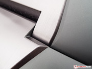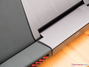 Die Base ließ sich mit nur mit viel Kraftaufwand leicht verwinden und blieb dabei stumm. Biegt man am mittelmäßig steifen, aber von hinten druckresistenten Display-Deckel herum, zeigen sich sofort Bildstörungen, die von ungesund klingenden Knistergeräuschen begleitet werden. Schade, dass der insgesamt hochwertige Eindruck, den die verwendeten Materialien und die ansonsten einwandfreie Verarbeitung ohne scharfe, überstehende Kanten und unregelmäßige Spaltmaße hinterlassen hat, so einen leichten Dämpfer erhält. Wie schon bei früheren ROG Notebooks lässt sich der Deckel nicht einmal bis auf 130 ° öffnen, was in der Praxis aber kaum ein Nachteil sein dürfte. Aufgrund des Gewichts der Base gelingt das Öffnen ohne Gegenhalten.