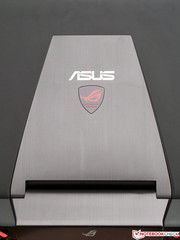 Asus hat im Vergleich zum Vorgänger G750JZ einige Veränderungen vorgenommen, ist aber der ROG-typischen, kantigen und futuristischen Formensprache treu geblieben, sodass auch der Neuling auf den ersten Blick als Mitglied der Asus-ROG-Familie erkennbar ist. Das Brushed-Metal Finish der Oberseite ist einem Softtouch-Finish gewichen, das gerne Fingerabdrücke annimmt und sich auch an der Deckelrückseite wiederfindet. Die Oberseite der Base ist jetzt völlig plan und nicht mehr nach innen hin abgesenkt, die Beschriftung der Tasten rot statt weiß. Den auffälligsten optischen Akzent setzt ein großes Element an der Deckelrückseite, das eine anthrazitfarbene Brushed-Metal-Oberfläche aufweist und sich unter den Scharnieren fortsetzt. Dort prangt in der Mitte das Asus Label und darunter das beleuchtete ROG Logo. An der Hinterseite befinden die beiden charakteristischen Luftauslässe, deren Leitelemente metallic-orange lackiert sind. Der Autor findet, dass das schicke Gehäuse noch etwas mehr hermacht als das des Vorgängers Asus G750JZ.