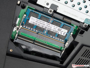 Bei unserem Testsample handelt es sich um ein Shopgerät, sodass eine komplette Demontage leider nicht infrage kam. Da die Wanne bis zur Oberseite der Base hochgezogen ist, dürfte man von oben Zugang zu Innereien wie den Lüftern erhalten. Unten gibt es eine per Schraube gesicherte und einfach zu öffnende Wartungsklappe, die SSD, Festplatte und die RAM-Steckplätze freilegt. Der Akku ist fest verbaut.