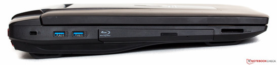 Vier USB-3.0-Ports hat Asus seinem neuen Gamer spendiert, zwei davon sitzen hinten links, wo eingesteckte Kabel und USB-Sticks kaum stören. Die beiden anderen befinden sich zusammen mit Audio, HDMI, Ethernet, VGA und Strom mittig auf der rechten Seite. Hier wartet auch der zukunftsweisende Thunderbolt-Anschluss, der mit verschiedenen Protokollen wie DisplayPort und PCI Express umgehen kann und es so erlaubt, verschiedenste mit Thunderbolt ausgestattete Peripheriegeräte inklusive Bildschirme mit hohem Tempo anzubinden. Dabei ist es auch möglich, bis zu sechs Geräte ohne Leistungsverlust in Reihe zu schalten. Der Thunderbolt-Port ist mechanisch und elektrisch abwärtskompatibel zu Mini-DisplayPort-Steckern. Langfristig könnte Thunderbolt die verbreitete und günstige USB-Schnittstelle ersetzen, allerdings sind entsprechende Geräte noch rar gesät und teuer. Die externe USB-3.0-Festplatte des Autors schafft an den meisten Notebooks einen Durchsatz von bis zu 95 MB/s, das Asus G751JY ist da keine Ausnahme.