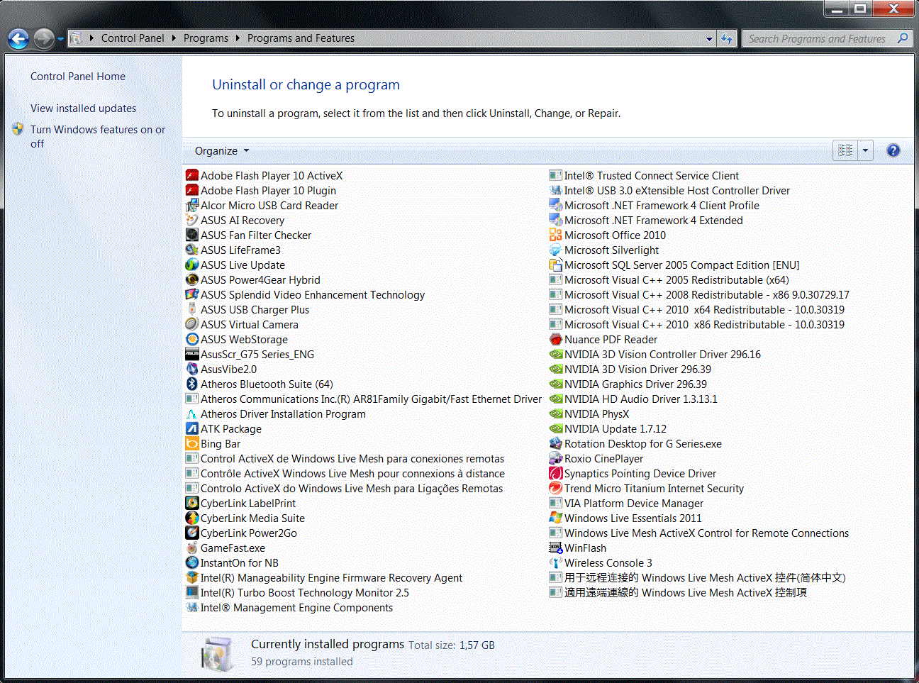 Wer ein Asus Notebook erwirbt, darf sich nicht über ein „zugemülltes“ Betriebssystem wundern. Bei der Auslieferung sind bereits knapp 60 Programme, Updates und Treiber installiert. Um die (Boot-)Geschwindigkeit zu erhöhen und das Pop-Up-Aufkommen zu verringern, sollte man die unnötigen Bestandteile deaktivieren oder gleich über Bord werfen. Spezielle Bildmodi (Splendid-Technologie) und Energiesparpläne (Power4Gear) sind kaum mehr als ein nettes Gimmick.