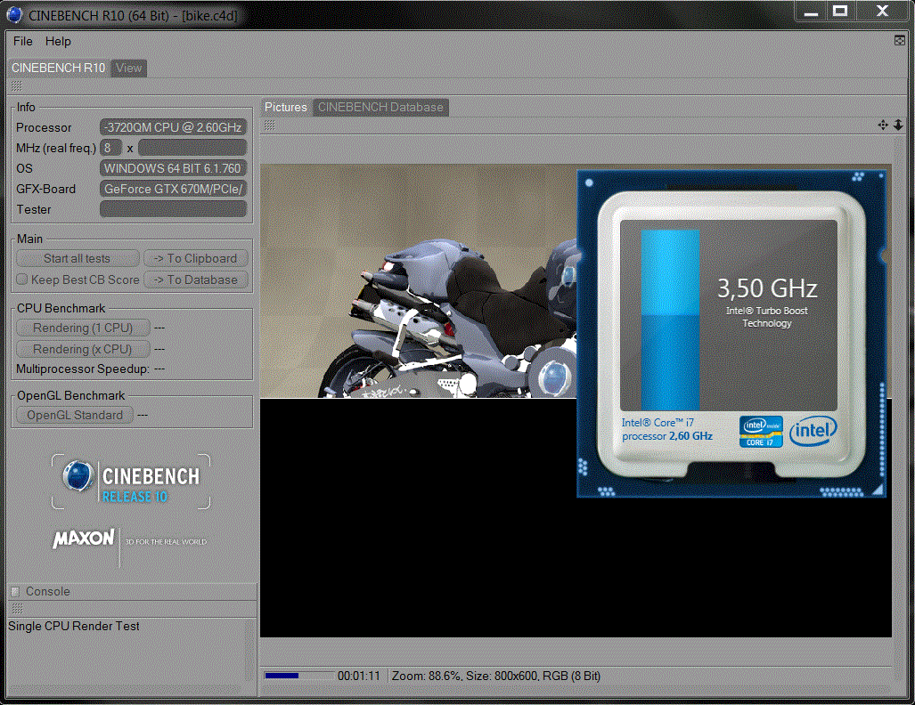 Solange das Notebook nicht komplett ausgelastet wird, hebt der Core i7-3720QM seine Taktfrequenz deutlich an. Beispiel gefällig: Im Cinebench R10 lief der Vierkerner zwischen 3.4 GHz (Multi-Core-Rendering) und 3.6 GHz (Single-Core-Rendering). Ein üppiges Resultat, von dem die meisten CPUs nur träumen können.