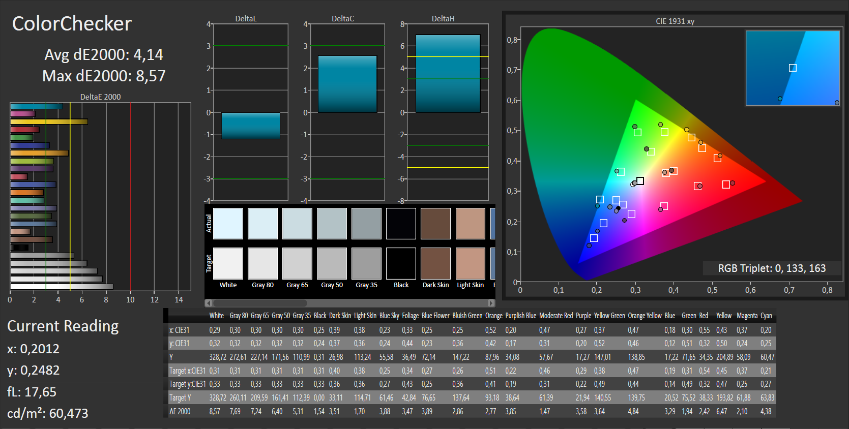 | Delta E Colorchecker * | 4.14 | 4.9 -18% | 11.14 -169% |