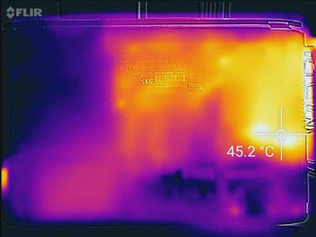 (-) Auf der Unterseite messen wir eine maximalen Wert von 45.2 °C (im Vergleich zum Durchschnitt von 43.3 °C).