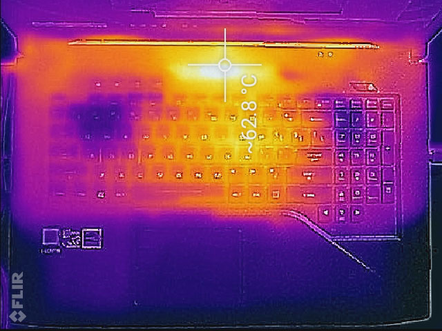 Die Gehäusetemperaturen sind interessant. Es gibt einige Hotspots, die unter hoher Belastung unangenehm warm werden, allerdings sollte der Nutzer kaum direkten Kontakt haben. Das Lüftergitter oberhalb der Tastatur erreicht beispielsweise bis zu 63 °C, doch man muss seine Hand schon absichtlich dort platzieren. Der mittlere Bereich der Tastatur kann ebenfalls recht warm werden, doch diese Tasten werden beim Spielen in der Regel nicht so oft genutzt. Auch die Unterseite wird im Bereich der Lüftergitter sehr warm, und beim Spielen sollte man das Gerät auf einem Schreibtisch abstellen. Im Leerlauf oder bei wenig Last erwärmt sich das Gerät jedoch kaum.