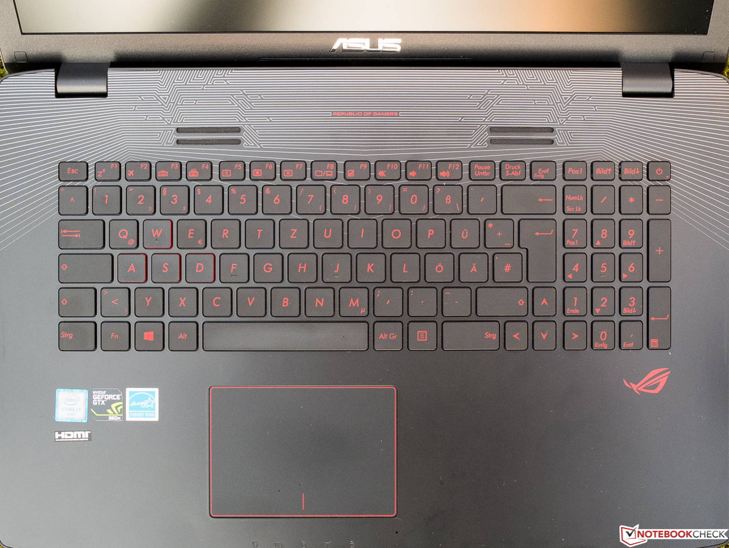 Offenbar setzt Asus auf die gleiche Chiclet-Tastatur wie beim schon erwähnten GL552JX, optisch und haptisch sind jedenfalls keine Unterschiede auszumachen. So bleibt der Hersteller leider trotz des bei diesem Modell nun wirklich reichlich vorhandenen Platzes bei einem verkleinerten und damit ergonomisch suboptimalen Nummernblock und hat den mit einer Status-LED versehenen On/Off-Button wieder als oberste rechte Taste in diesen integriert. Davon abgesehen entspricht das Layout im Wesentlichen den Erwartungen.