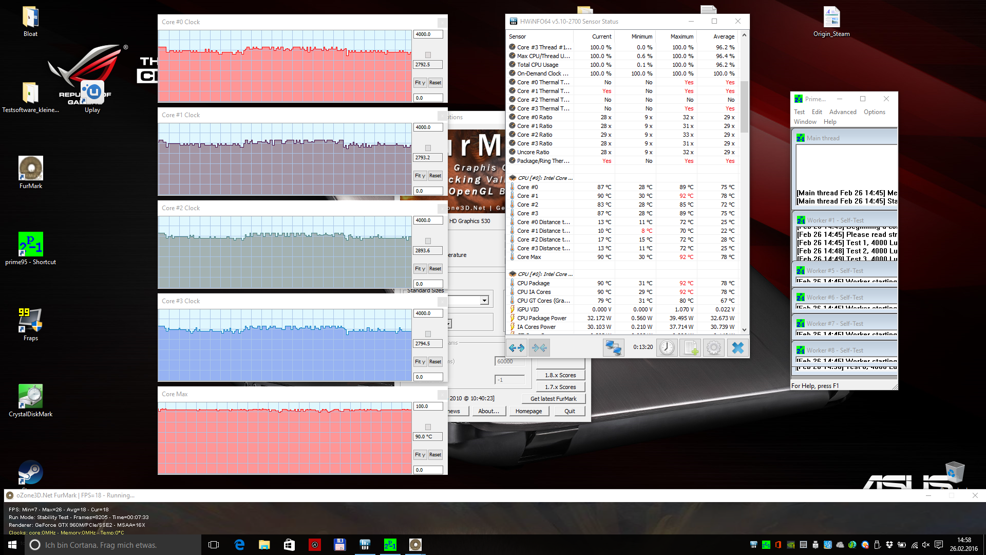 Nicht so schön sieht es leider mit den CPU-Temperaturen von bis zu 92 °C aus, die wir durch den gleichzeitigen Einsatz von Prime95 und FurMark erzielt haben. HWiNFO64 (Bild) weist für einige Kerne thermales Throttling aus. Zunächst konnten die Kerne die spezifizierten 3,1 GHz noch eine Weile halten, schwankten dann aber nur noch zwischen 2,5 und 2,9 GHz. Somit wird die Basisfrequenz von 2,6 in der Tat teilweise leicht unterschritten. In der Praxis tritt auch bei anspruchsvollen Games keine so hohe und vor allem durchgehende Belastung auf, sodass mit einer guten Turbo-Ausnutzung zu rechnen ist, die durch die unauffälligen Cinebench-Werte bestätigt wird.