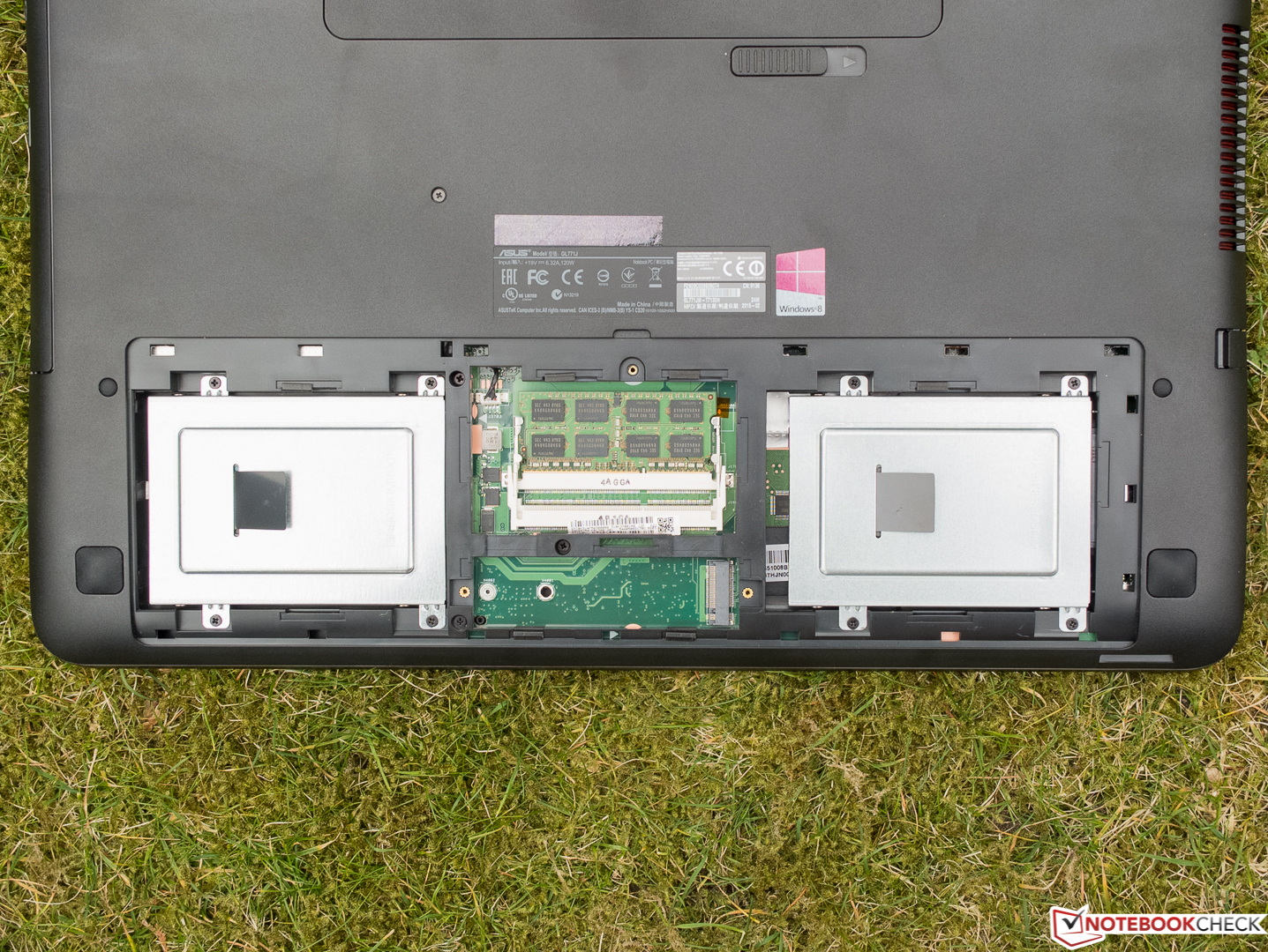 Gaming Notebooks laufen oft am Limit und müssen zwecks Kühlung jede Menge Luft bewegen. Dadurch sind sie relativ wartungsintensiv, was viele Hersteller aber nicht davon abhält, Nutzern den Zugang zum Inneren stark zu erschweren. Auch das Asus GL771JM muss demontiert werden, wenn man die Lüfter reinigen möchte. Es ermöglicht über seine mit nur einer Schraube gesicherte Wartungsklappe aber immerhin Zugriff auf die RAM-Bänke sowie die beiden Massenspeicher.