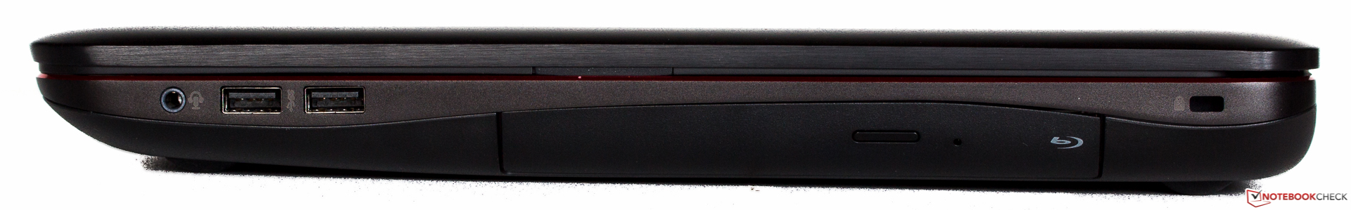 Die Anschlussausstattung ist auf den typischen Bedarf eines Gamers ausgelegt und bietet neben 4x USB 3.0 als einzige erwähnenswerte Besonderheit einen Mini DisplayPort (1.2), an den bis zu zwei weitere externe Bildschirme in Reihe angeschlossen werden können. Auch Gigabit-Ethernet darf bei einem zumeist stationär genutzten Notebook natürlich nicht fehlen. Leider versammeln sich die Anschlüsse – bis auf den Netzwerkport – alle im vorderen Bereich, wo eingesteckte Kabel und USB-Sticks die Bedienung mit einer externen Maus stören können.