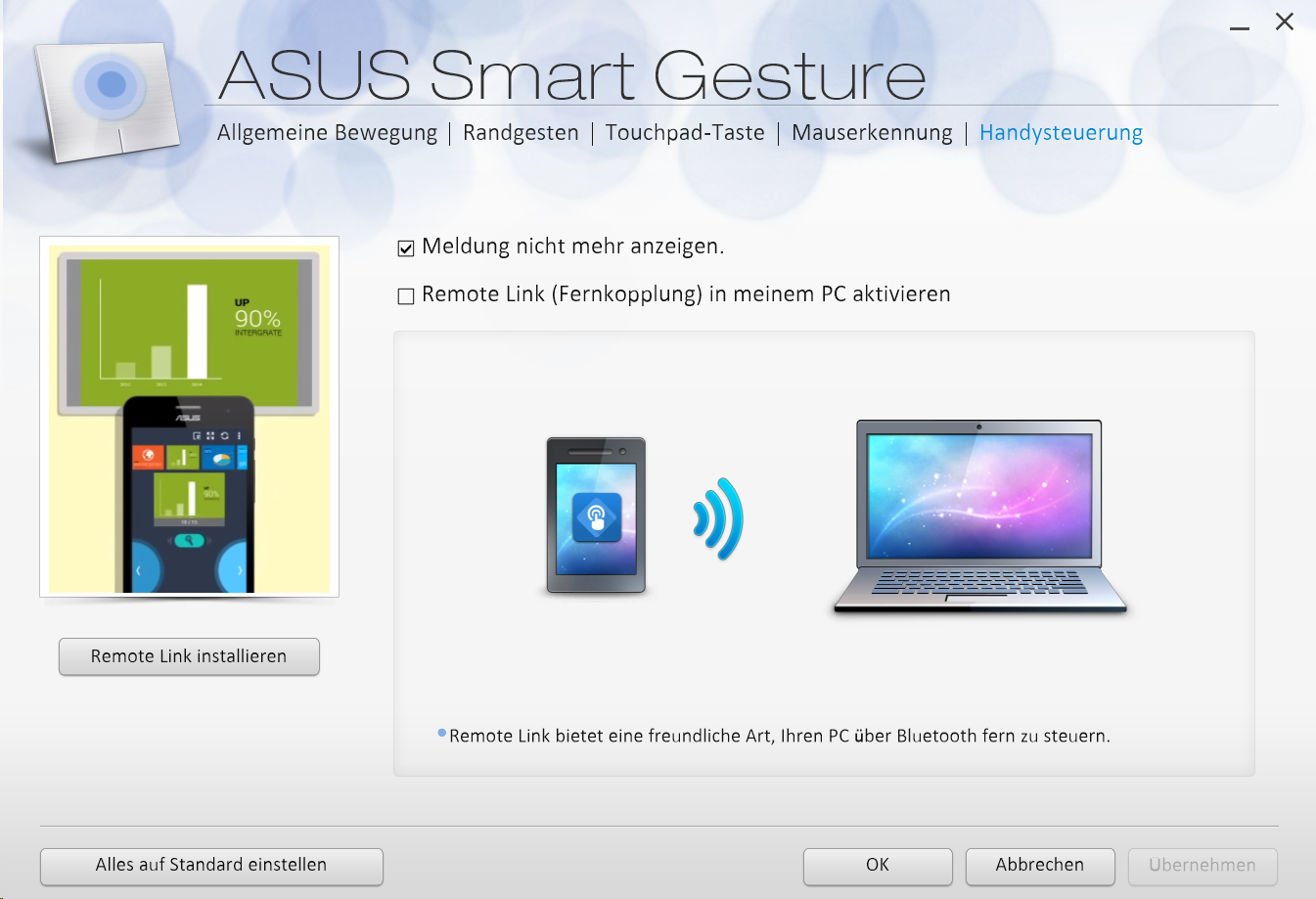 Die "Tasten" weisen einen kurzen Hub, einen angenehmen Widerstand und einen knackigen Druckpunkt auf, der zusammen mit einem deutlichen Klacken für ein gutes Feedback sorgt. Über die Software Asus Smart Gesture lassen sich Gesten mit bis zu drei Fingern umfangreich konfigurieren, zudem wird hier eine Android App angeboten, mit der sich das Smartphone als Fernsteuerung für das Notebook nutzen lässt.
