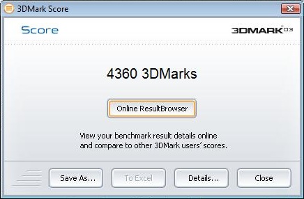 | 3DMark 03 Standard | 4360 Punkte | |