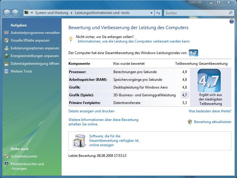 Der Vollständigkeit halber sei an dieser Stelle der Vista Leistungsindex erwähnt. Hier kam das K50IN auf insgesamt 4.9 Punkte für die CPU, 4.8 Punkte für Arbeitsspeicher und Grafik, 4.7 Punkte für die Spielegrafik und schließlich 5.3 Punkte für die Festplatte.