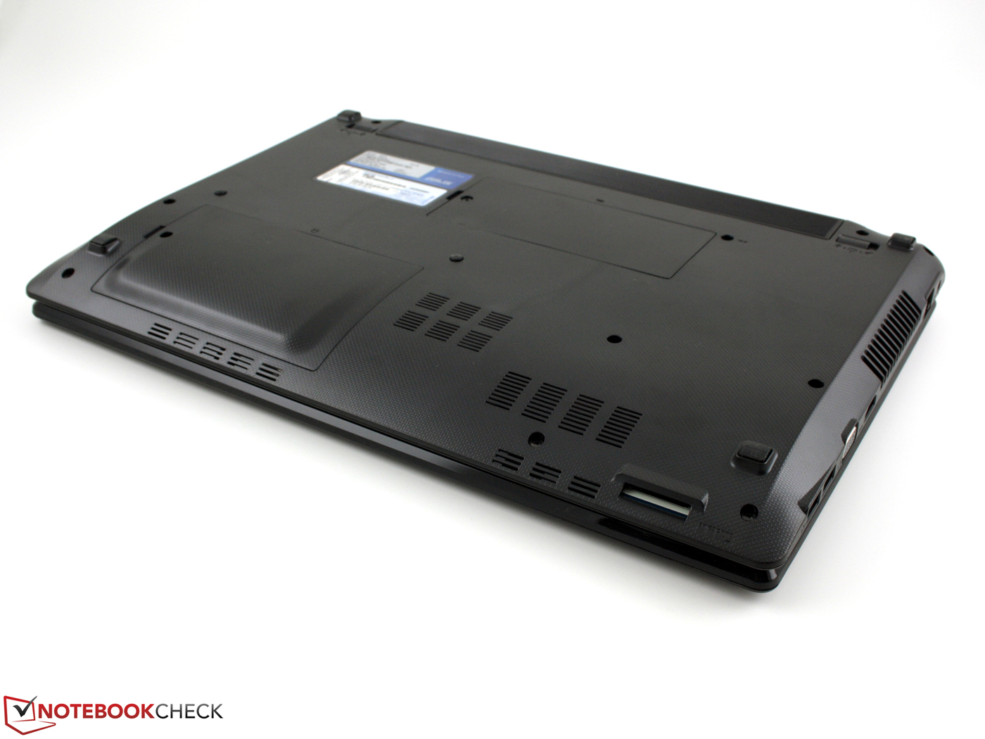 Die Bodenplatte aus gemustertem Kunststoff lässt sich nur über dem DVD-Laufwerk mit dem Finger eindrücken. Die beiden Öffnungen bieten die Option, Festplatte, Arbeitsspeicher und WLAN-Modul zu tauschen.