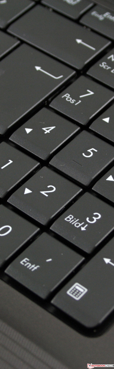 Das Layout ist, abgesehen von den eingequetschten Richtungstasten, gelungen. Der Ziffernblock hat das Standard-Format (4 Reihen). Die Tasten verfügen über einen ausreichenden Druckpunkt und Tastenhub. Der Tastenanschlag ist fest, weil die Fläche fast überall sicher aufliegt. Die einzige Ausnahme ist ein kleiner Bereich über dem DVD-Laufwerk. Hier geben die Tasten ein kleines Stück nach. Störend fällt die fehlende konische Wölbung auf. Diese sorgt für eine gewisse Ziel-Ungenauigkeit, denn die Finger finden schwerlich eine Orientierung.