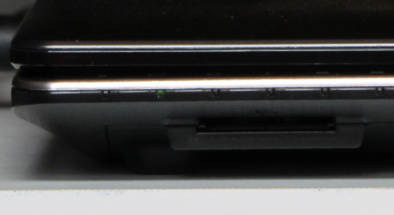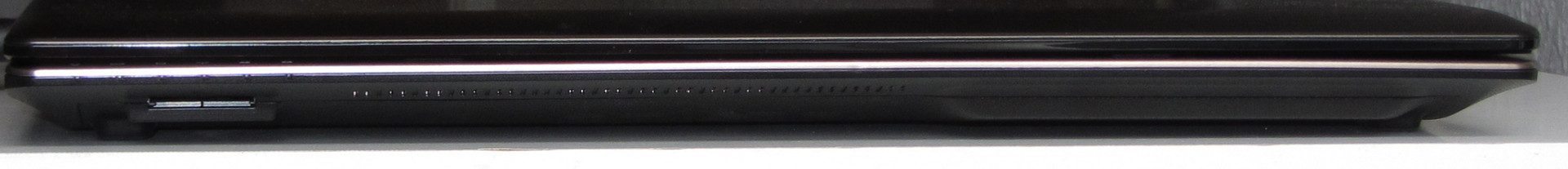 An der Vorderseite hat man Zugang zu dem Speicherkartenlesegerät. Es wird von einer Dummy-SD-Karte vor Verschmutzung geschützt. Das Lesegerät unterstützt nur SD- und MMC-Karten. Das ist der erwartete Standard. Immer mehr Notebooks unterstützen nur noch diese Speicherkartentypen. Das ist verständlich, da die SD-Karte sich quasi gegen alle anderen Speicherkartentypen durch gesetzt hat. Schade ist es trotzdem, da Besitzer anderer Speicherkarten auf ein USB-Lesegerät angewiesen sind.