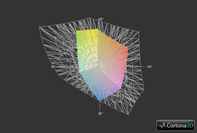 Sowohl den sRGB- als auch den AdobeRGB-Farbraum kann das Display nicht vollständig abbilden. Die unvollständige Abdeckung des sRGB-Farbraums hat für den normalen Anwender aber keine Auswirkungen. Die Differenz zum AdobeRGB-Farbraum fällt deutlich größer aus. Dieser Umstand schließt das Display für professionelle Grafikarbeiten aus.