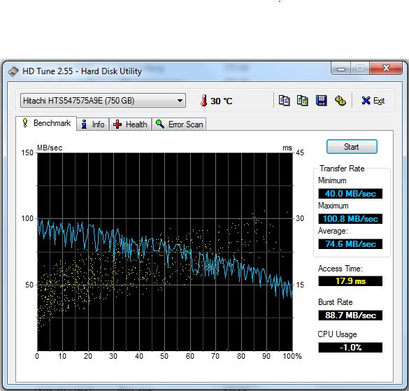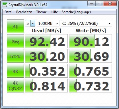 HD Tune und Crystaldiskmark bescheinigen der Festplatte eine eher durchschnittliche Geschwindigkeit. Auch der Windows 7 Leistungsindex macht die Festplatte als das schwächste Glied der Kette aus. Hier hätte Asus ganz klar auf eine schnelleres Modell setzen sollen. Eine Festplatte, die mit 7200 Umdrehungen arbeitet, wäre besser gewesen. Ein höherer Windows 7-Leistungindex und bessere PCMark-Ergebnisse wären daraus resultiert.