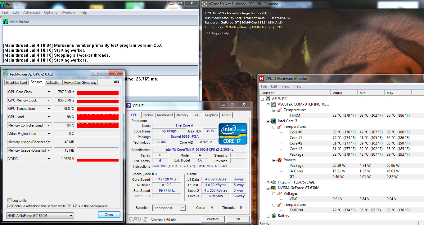 Asus verbaut in dem Notebook einen Intel Core i7-3610QM-Prozessor. Der Core i7-3610QM ist ein Vertreter aus Intels neuester Prozessorgeneration "Ivy Bridge". Er verfügt über vier Rechenkerne. Die CPU wird regulär mit Geschwindigkeiten bis zu 2,3 GHz betrieben. Das Betriebssystem kann den Prozesor aber bei Bedarf auf bis zu 3,3 GHz übertakten (Intel Turbo Boost). Allerdings kann nur ein Kern auf 3,3 GHz beschleunigt werden. Wenn das Betriebssytem alle Kerne gleichzeitig übertaktet, wird eine Maximalgeschwindigkeit von 3,1 GHz erreicht. Der Turbo Boost steht auch im Akkubetrieb zur Verfügung. Allerdings wird er dann seltener und konservativer eingesetzt. Die Werte konnte in der Praxis mit HWInfo bestätigt werden.