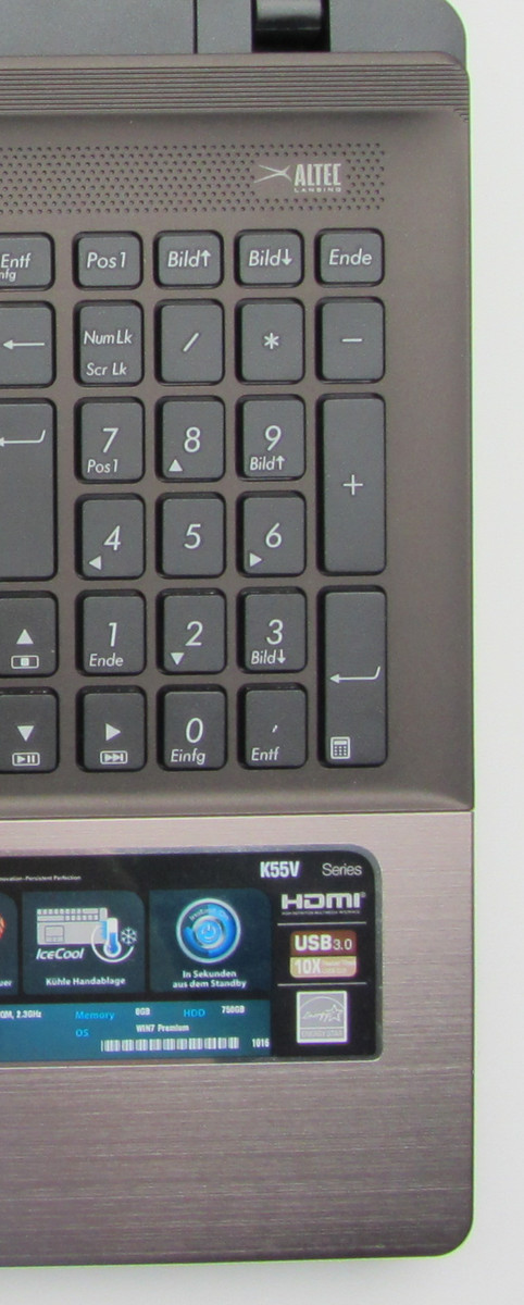 Asus verbaut in dem K55VM-SX064V Lautsprecher der Marke Altec Lansing. Für ein Notebook klingen die Lautsprecher ganz gut. Der Klang ist voluminös dabei allerdings ein wenig dumpf.