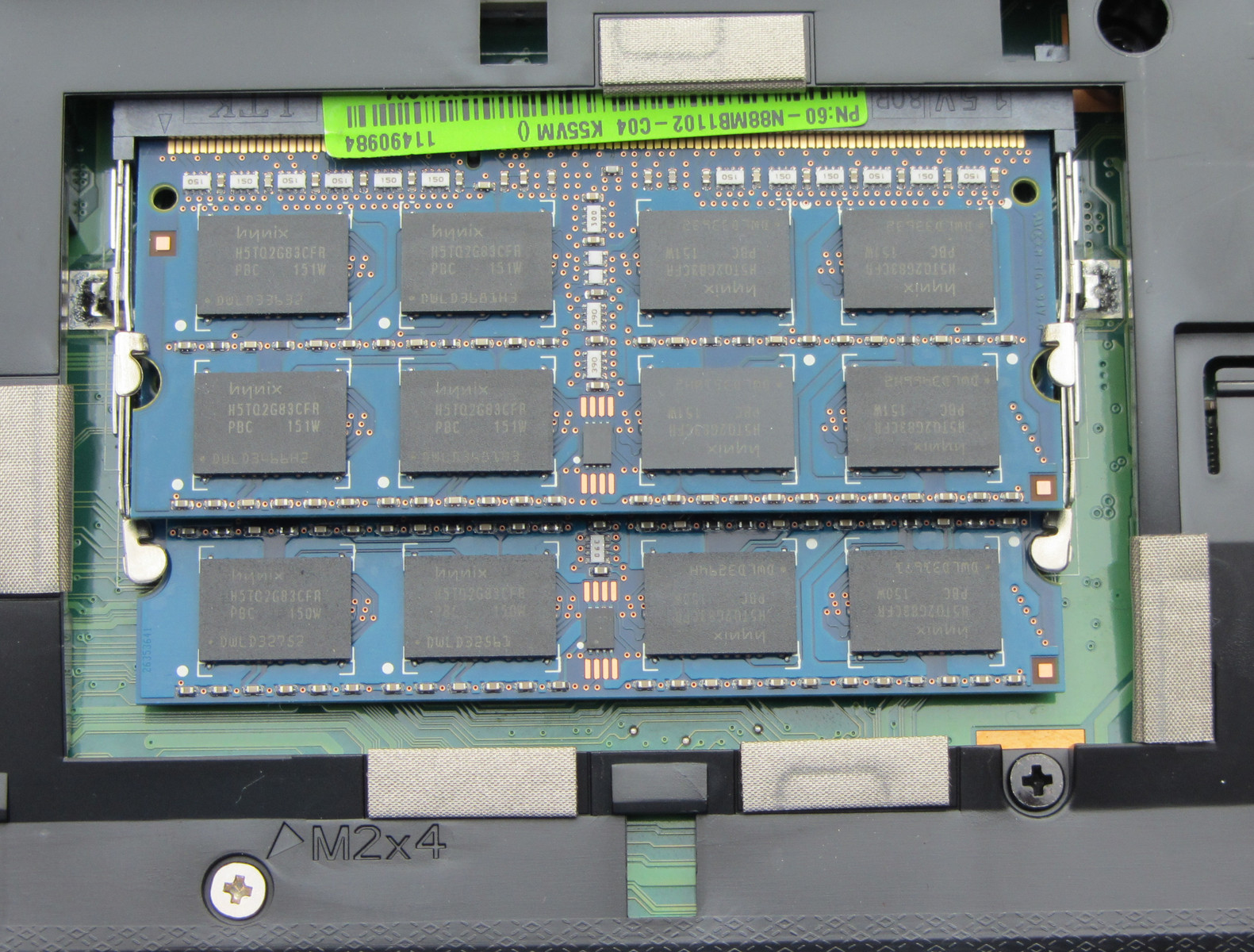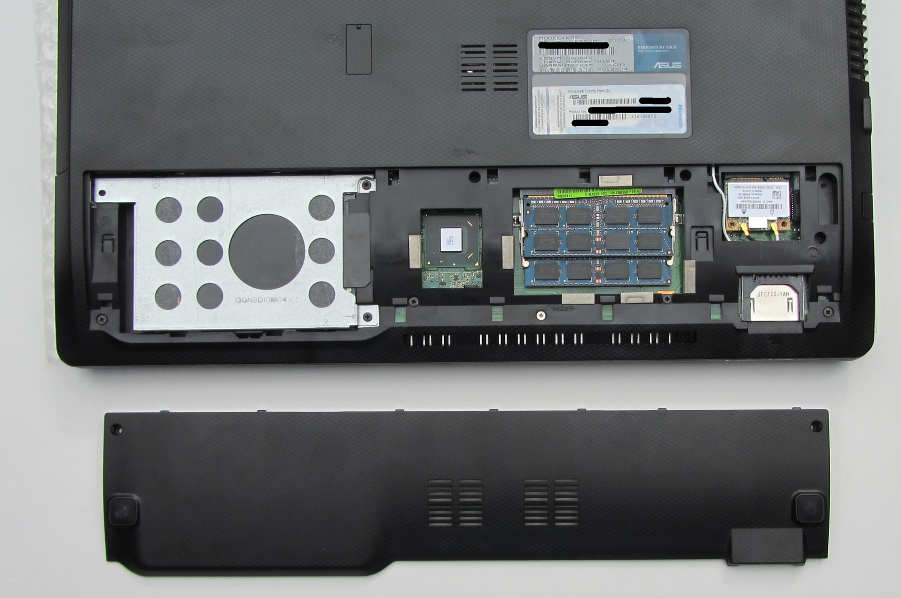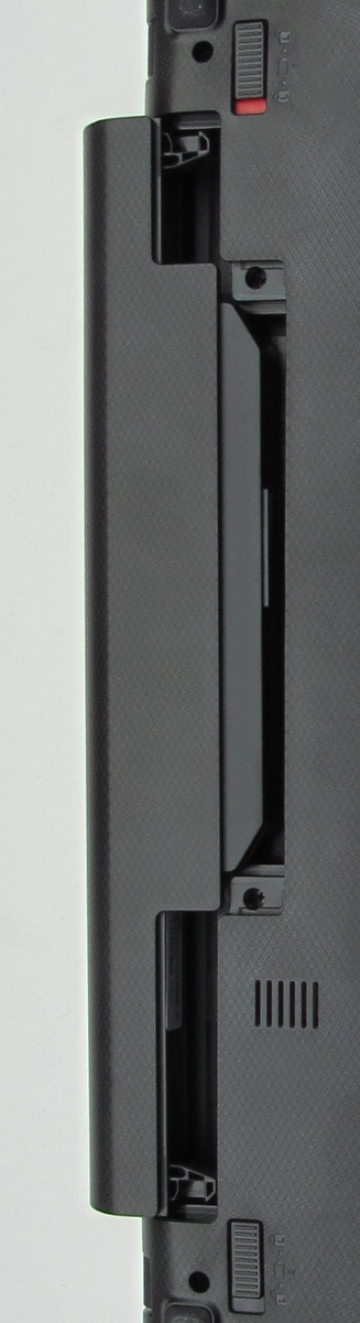 Auf die Festplatte und den Arbeitsspeicher kann man über eine große Klappe auf der Unterseite zugreifen. Die Klappe wird von zwei Schrauben gehalten. Das Notebook verfügt über zwei Arbeitsspeichersteckplätze, die beide belegt sind. Reichen die verbauten 8 GB Arbeitspeicher nicht aus, können die Module problemlos gegen größere getauscht werden. Das Notebook kann maximal 16 GB Arbeitsspeicher nutzen. Die Festplatte lässt sich einfach entnehmen und bei Bedarf gegen ein anderes Modell austauschen. Zugang zu dem Lüfter hat man nicht.