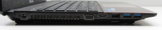 Das Asus K55VM-SX064V bietet in Sachen Anschlüsse allenfalls Standardkost. Auf der linken Seite des Notebooks finden sich ein VGA- und ein HDMI-Ausgang, sowie der RJ45-Gigabit-Ethernet-Anschluss und 2 USB 3.0-Steckplätze. Auf der rechten Seite finden sich der Mikrofonanschluss und der Kopfhöreranschluss. Auch ein dritter USB-Anschluss ist dort zu finden - allerdings entspricht dieser nur dem USB 2.0-Standard.