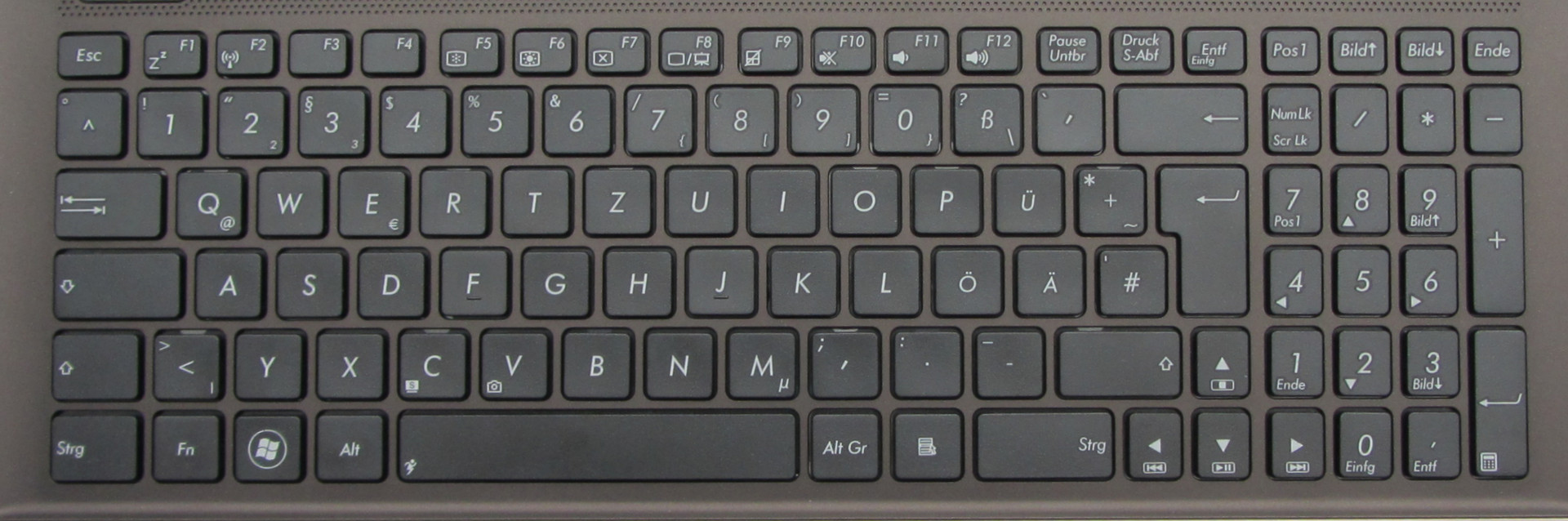 Das Asus K55VM-SX064V ist mit einer Chiclet-Tastatur ausgrüstet. Ein Nummernblock ist vorhanden. Die Haupttasten haben eine Größe von 15mm x 15mm, die F-Tasten von 13mm x 9mm, die Nummerblocktasten von 12mm x 15mm. Der Tastenabstand beträgt 4 mm. Die Tastengröße und der Tastenabstand ermöglichen ein komfortables Schreiben. Auch der Anschlag der Tasten ist ausreichend - könnte aber trotzdem eine Spur knackiger sein. Eine Tastaturbeleuchtung existiert nicht.